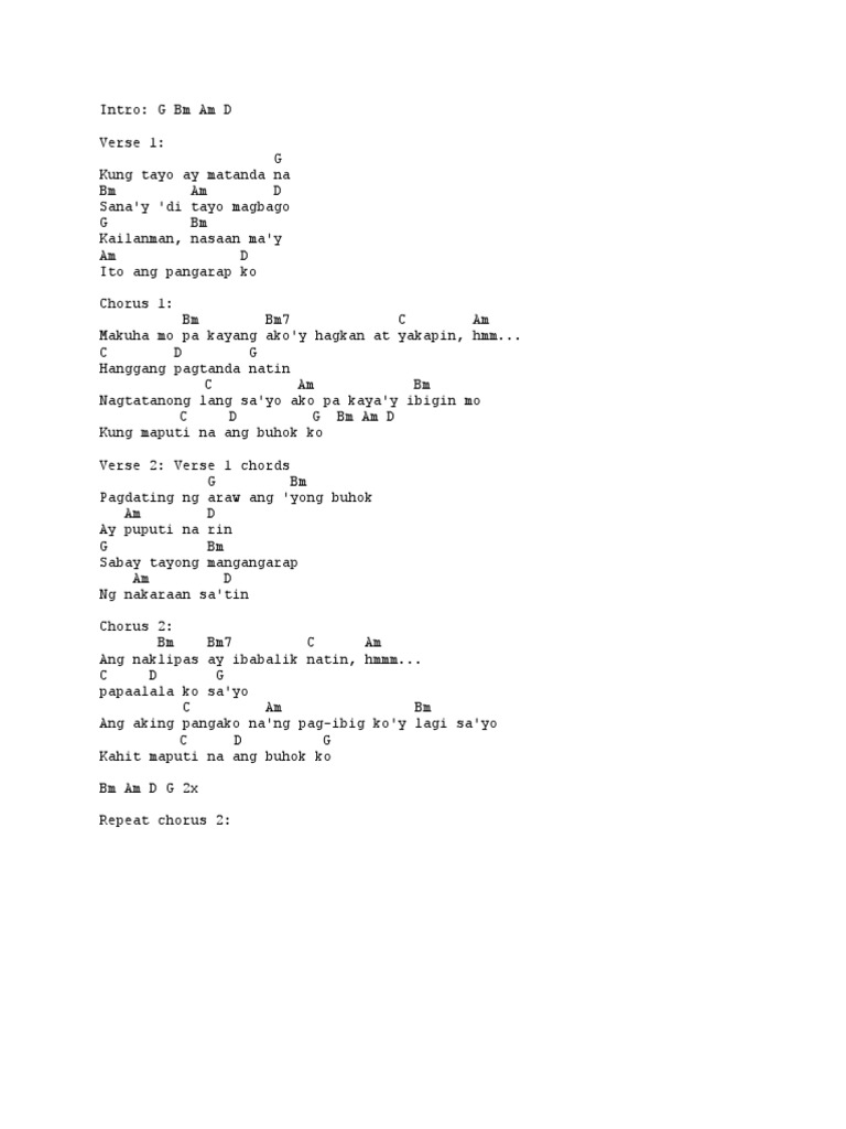 C papaal D ala ko s G ayo Ang aking C pangako na Am ng pag-ibig koy Bm lagi sayo Kahit mapu C ti na a D ng buhok ko G. Kung tayoy matanda na Sanay di tayo magbago At kailan may nasaan may Ito ang pangarap ko Makuha mo pa kayang Akoy hagkan at yakapin ooh Hanggang pagtanda natin Nagtatanong lang sa yo Ako pa kayay ibigin mo Kung maputi na ang buhok ko Pagdating ng araw Ang yong buhok Ay puputi na rin puputi na rin Sabay tayong mangangarap Ng nakaraan. Download 1 file.
